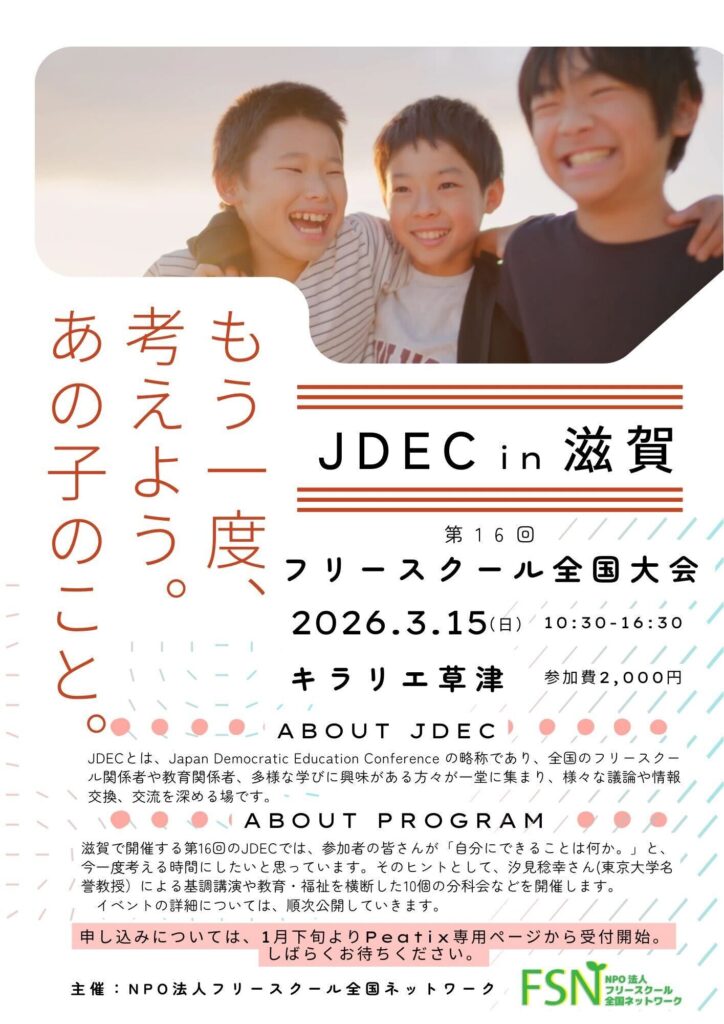 第16回 JDEC(Japan Democratic Education Conference)2026として、3月に滋賀県で開催する運びとなりました。